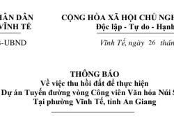Thông báo về việc thu hồi đất để thực hiện Dự án Tuyến đường vòng Công viên Văn hóa Núi Sam tại phường Vĩnh Tế, tỉnh An Giang