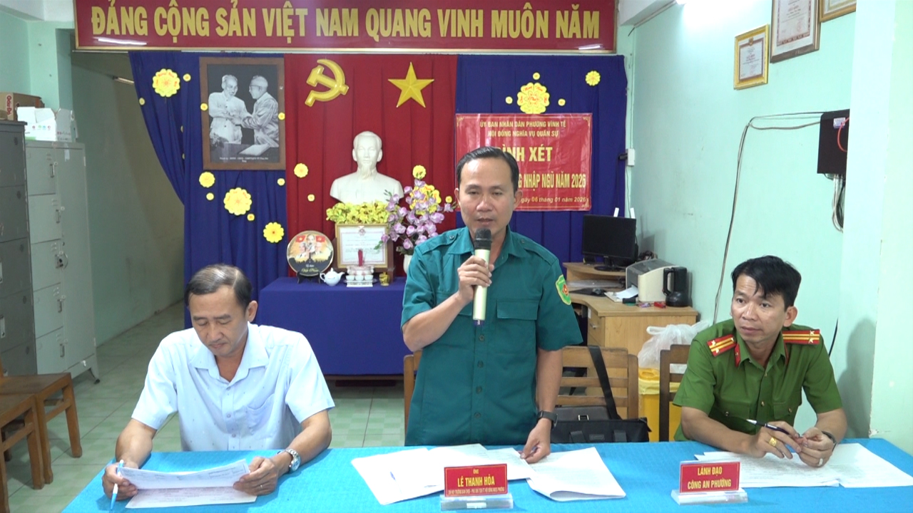 Chiều ngày 06/01, đồng chí Lê Thanh Hòa, Chỉ huy trưởng Ban CHQS phường Vĩnh Tế chủ trì hội nghị bình xét công dân sẵn sàng nhập ngũ năm 2026 ở các khóm: Vĩnh Đông, Vĩnh Đông 1, Vĩnh Đông 2, Vĩnh Phước, Vĩnh Phước 1, Mỹ Thuận, Mỹ Phú.