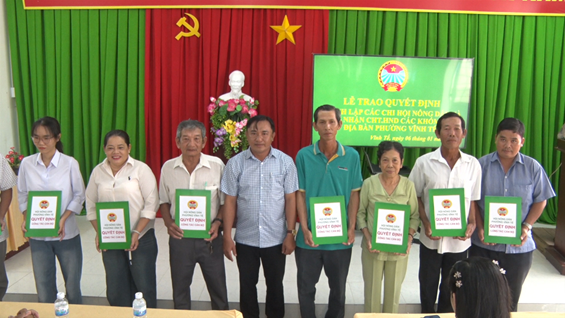 Tại buổi lễ, Hội Nông dân phường Vĩnh Tế đã công bố và trao quyết định thành lập Chi hội và công nhận Chi hội trưởng Hội Nông dân cho 16 khóm.